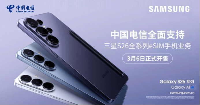 3月6日,三星Galaxy S26、Galaxy S26+、Galaxy S26 Ultra三款機型正式上市銷售,成為首個全系列支持中國電信eSIM功能的手機產品。三星S26系列三款機型全系支持eSIM,進一步完善了中國電信高端eSIM終端矩陣,也為行業樹立了全系列適配eSIM的新標桿,標志著eSIM功能正逐步成為新上市機型的標配,國內eSIM手機普及進入快車道。