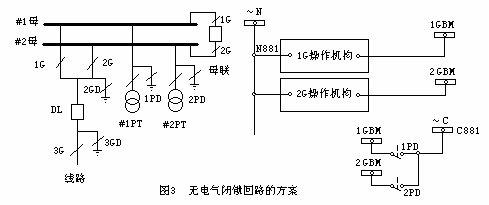 ②沒有電氣五防回路的解決方案(如圖3所示),只將母線接地刀閘的輔助接點串接在母線刀閘的控制回路中即可(此方案需增加電纜),其它閉鎖(如倒母線條件)靠微機五防閉鎖。以上二方案簡單、可靠,沒有增加正常運行操作和事故處理的復雜性[3]。