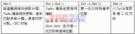在一個TTI周期為10ms的通路中上行編碼各階段所占用的時隙分配如表1。該TTI周期所需的信道編碼參數在該slot 0確定,并且由傳輸格式半靜態參數和動態參數計算出Turbo或卷積的編碼參數和速率匹配參數