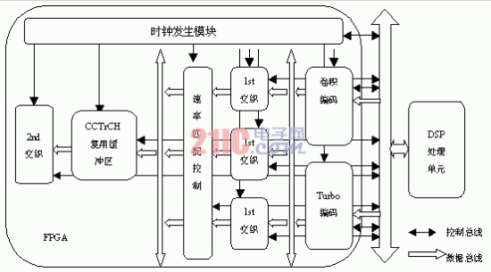 FPGA完成信道解碼中的各個具體模塊的實現,并且每個功能模塊提供相應的控制接口。DSP通過這些控制接口對各硬件模塊進行參數配置、任務調度,從而控制多個下行傳輸信道的解碼過程,并能夠最大限度的調度各個功能模塊為多個傳輸信道服務,這樣實現了各個功能模塊為多個傳輸信道所共享,提高同時處理多路下行信道的能力。整個流程充分考慮到了DSP和FPGA各自的優缺點,通過軟硬件的相互配合,協同處理來提高整個系統的性能。