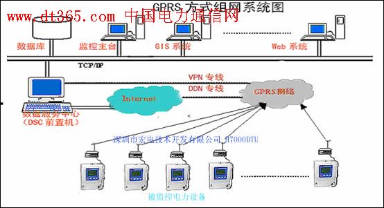 GPRS方式組網(wǎng)系統(tǒng)采用GPRS數(shù)據(jù)通信通道,在 監(jiān)控終端、GPRS基站、GPRS交換機(jī)房、供電公司之間建立一個(gè)虛擬專網(wǎng)(VPN),為保證通道的穩(wěn)定、可靠,在移動(dòng)機(jī)房與電力公司機(jī)房直接敷設(shè)光纜聯(lián)接,所有數(shù)據(jù)經(jīng)過(guò)加密傳輸,確保任何數(shù)據(jù)不受非法侵入修改,且前期投入及日常維護(hù)費(fèi)用少。