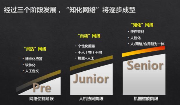 階段一:網絡使能階段。 網絡進行軟硬解耦,物理網絡向高維度的軟件化發展,實現一個更靈活的網絡。這時網絡通過SDN、NFV等技術,屏蔽底層硬件的差異,實現網絡的扁平化和集中配置,主要能實現標準化的應答服務。網絡將實現人工軟件定義,更強的可管可控。