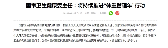 “兩會”期間,國家衛生健康委雷海潮主任說,將持續推進“體重管理年”行動,許多同志腰圍太大,體重超重,有人甚至患上了慢性病……有關慢性病防控和體重管理,要注重防治結合,提供個性化服務。